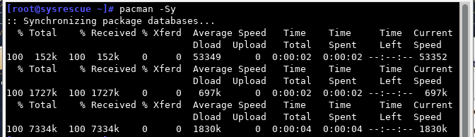 [root@sysrescue ~]# pacman -Sy :: Synchronizing package databases... % Total % Received % Xferd Average Speed Time Time Time Current Dload Upload Total Spent Left Speed 100 152k 100 152k 0 0 53349 0 0:00:02 0:00:02 --:--:-- 53352 % Total % Received % Xferd Average Speed Time Time Time Current Dload Upload Total Spent Left Speed 100 1727k 100 1727k 0 0 697k 0 0:00:02 0:00:02 --:--:-- 697k % Total % Received % Xferd Average Speed Time Time Time Current Dload Upload Total Spent Left Speed 100 7334k 100 7334k 0 0 1830k 0 0:00:04 0:00:04 --:--:-- 1830k