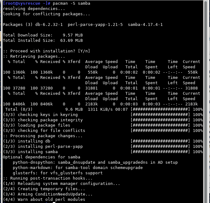 [root@sysrescue ~]# pacman -S samba resolving dependencies... looking for conflicting packages... Packages (3) db-6.2.32-1 perl-parse-yapp-1.21-5 samba-4.17.4-1 Total Download Size: 9.57 MiB Total Installed Size: 63.69 MiB :: Proceed with installation? [Y/n] :: Retrieving packages... % Total % Received % Xferd Average Speed Time Time Time Current Dload Upload Total Spent Left Speed 100 1360k 100 1360k 0 0 558k 0 0:00:02 0:00:02 --:--:-- 558k % Total % Received % Xferd Average Speed Time Time Time Current Dload Upload Total Spent Left Speed 100 37280 100 37280 0 0 31801 0 0:00:01 0:00:01 --:--:-- 31808 % Total % Received % Xferd Average Speed Time Time Time Current Dload Upload Total Spent Left Speed 100 8406k 100 8406k 0 0 2183k 0 0:00:03 0:00:03 --:--:-- 2183k Total (0/3) 9.6 MiB 1311 KiB/s 00:07 [######################] 100% (3/3) checking keys in keyring [######################] 100% (3/3) checking package integrity [######################] 100% (3/3) loading package files [######################] 100% (3/3) checking for file conflicts [######################] 100% :: Processing package changes... (1/3) installing db [######################] 100% (2/3) installing perl-parse-yapp [######################] 100% (3/3) installing samba [######################] 100% Optional dependencies for samba python-dnspython: samba_dnsupdate and samba_upgradedns in AD setup python-markdown: for samba-tool domain schemeupgrade glusterfs: for vfs_glusterfs support :: Running post-transaction hooks... (1/4) Reloading system manager configuration... (2/4) Creating temporary files... (3/4) Arming ConditionNeedsUpdate... (4/4) Warn about old perl modules